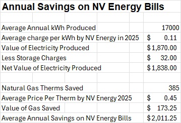 Our savings are likely to increase over time as the demand for electricity and natural gas increases, particularly with the growth in data centers to power AI. I recently read an article that projected a quadrupling of our energy demands in northern Nevada! It is expected that residential customers will be shouldering a portion of these costs through increased prices. If this happens, we could see the value of our panels increase significantly.