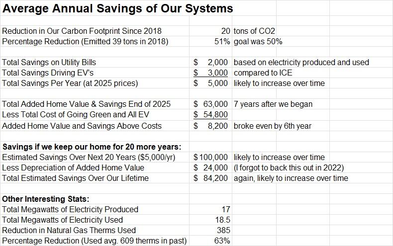 Adding all of these systems increases electricity use. We now use about 2.75 times more than we used in the past. Prior to 2019, we were using about 6800 kWh per year in our household. Now our household uses about 13,500, almost double. We also put about 5,000 kWh in our EV’s in 2025, for a total increase of 11,700 kWh. What saves money and carbon is using the solar panels to generate most of this increase. Some of the increase is due to caring for my elders, which involves a lot of driving (e.g. we provide my mother’s transportation and run all her errands). We think that our own personal use is about what we produce at this point, which was our goal.