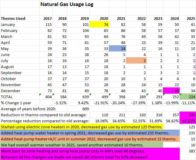 I realized that I was not capturing the full value of our solar panels in my previous calculations. Now that we are using all the electricity we produce, our utility savings is a mix of the value of the electricity produced at current electrical rates + the value of the gas savings at current gas rates. We now use 63% less natural gas than we did in the past.