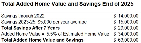 Below is a breakdown of the total added home value and savings from the first table. I reference the savings I calculated when I did my last review in 2022. In that blog, I shared what we did in a lot more detail and offered suggestions if you want ideas for greening your own life (https://rhondaashurst.com/2023/03/05/year-4-its-all-coming-together/).